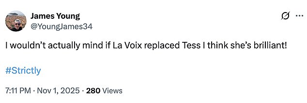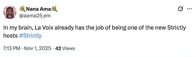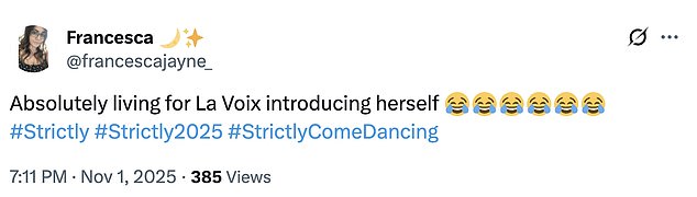 They gushed: ‘La Voix has the personality & humour to be one of the new Strictly presenters!’; ‘La Voix is pure entertainment. Everything she does/says is gold.’