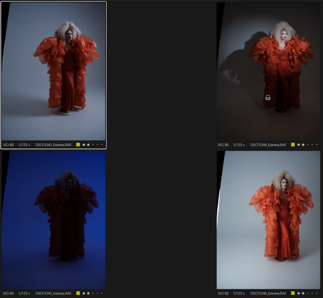 For our setup, I knew that the technique would work in theory but I had not actually gotten to try it with a model yet, so I was secretly very nervous. We set up our lights in a four-light setup — which shifted around for each performer — but the idea was the same. I would use the Fujifilm GFX100 II camera’s 8 fps mode to burst-capture photos, and every time the shutter closed, a different light would flash the next exposure. 1, 2, 3, 4, 1, 2, 3, 4. This allowed for different lights to accentuate different aspects of the drag artist’s form and outfit — but in the same moment, so the pose was identical, allowing me to “collage” them together, like an unscrambled Picasso.