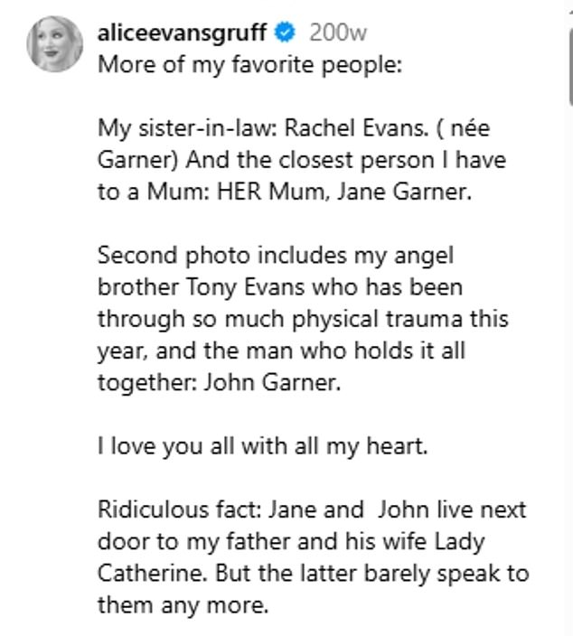 Next to the snaps, Alice wrote: My sister-in-law: Rachel Evans. ( née Garner) And the closest person I have to a Mum: HER Mum, Jane Garner.