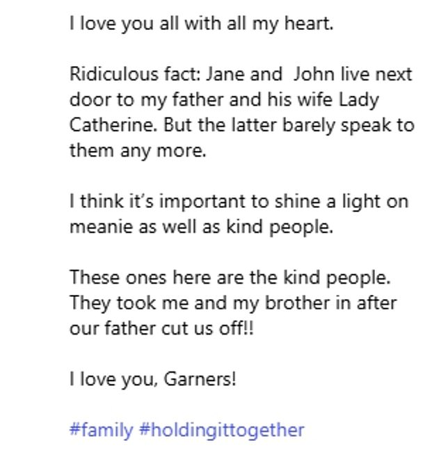 ‘I love you all with all my heart. Ridiculous fact: Jane and John live next door to my father and his wife Lady Catherine. But the latter barely speak to them any more.