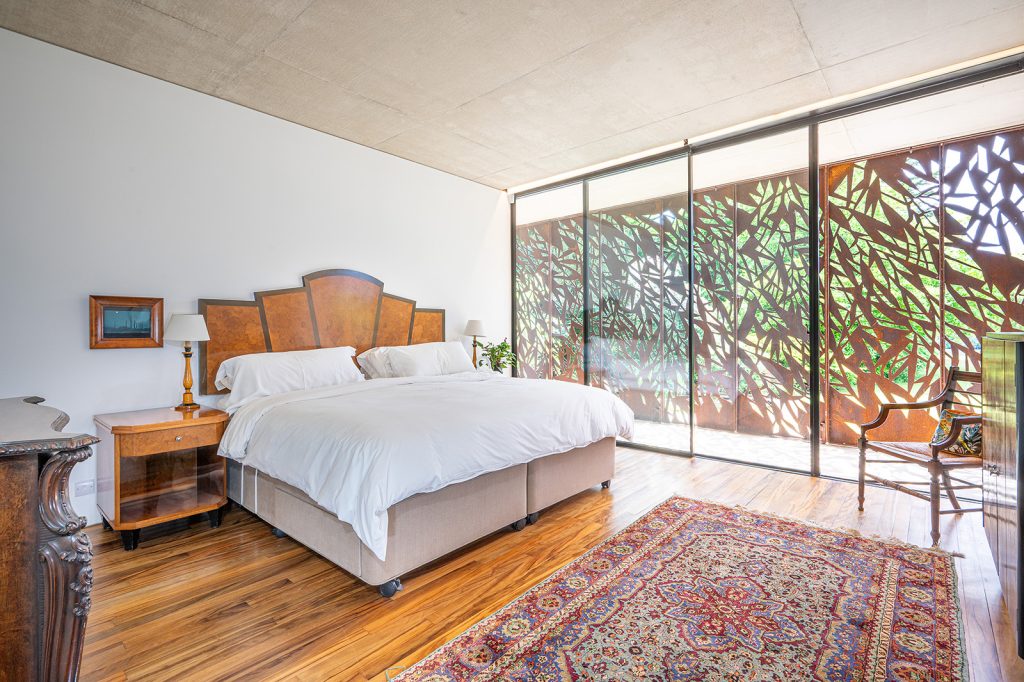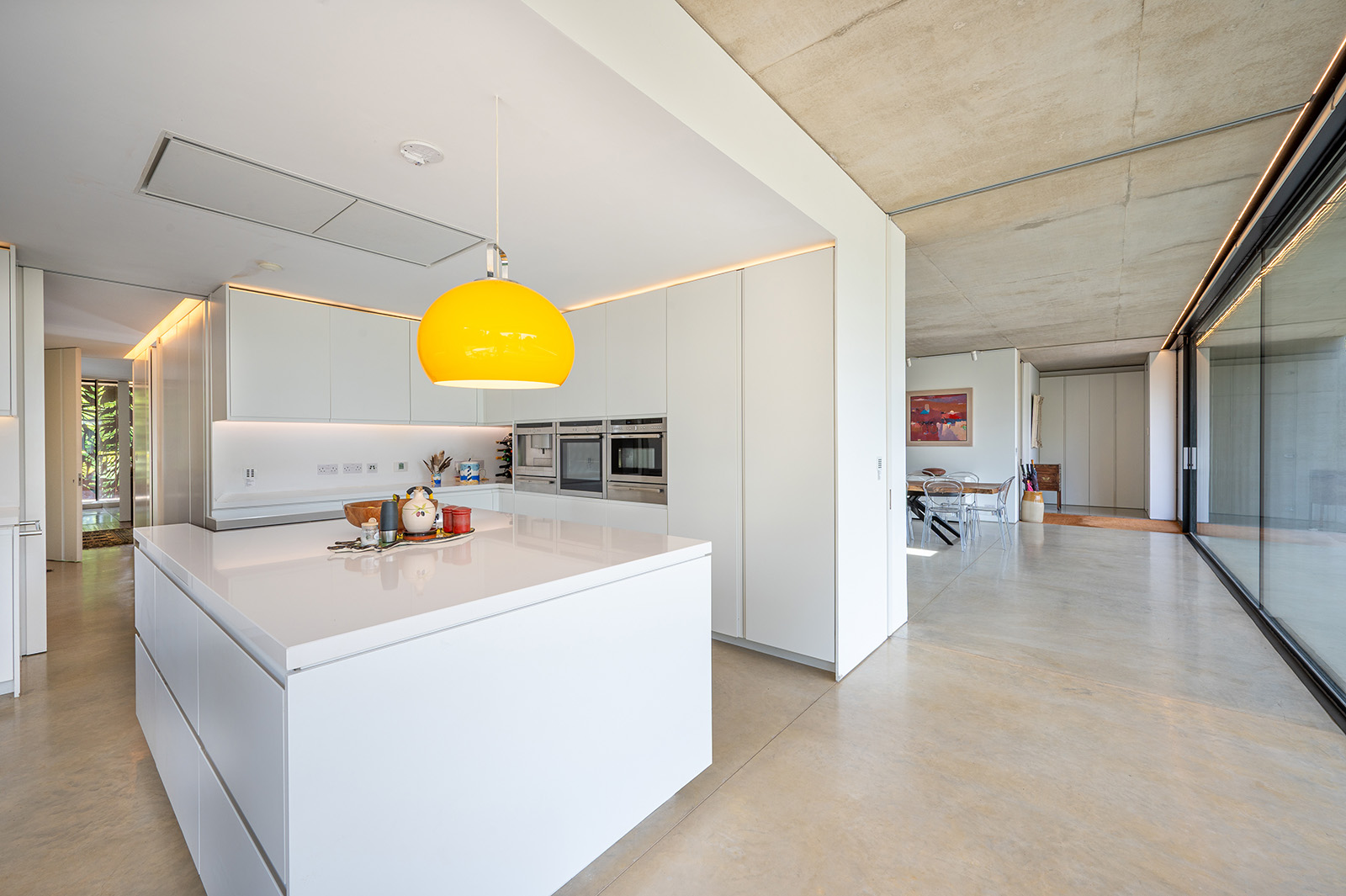 The ground-floor layout incorporates the bulk of living spaces, with the open-plan living and dining rooms, kitchen and principal bedroom suite. Four additional en suite bedrooms are upstairs. To the rear of the house is a Corten steel brise soleil at ground floor level, which mitigates the impact of the sun in summer while maximising solar gain in winter.