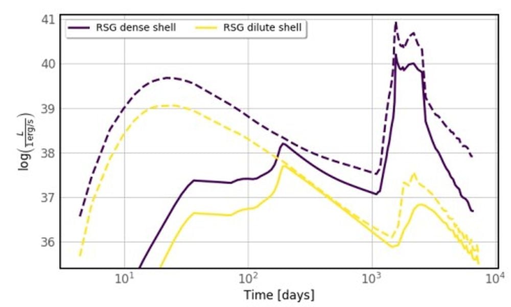 “After evaluating the thermal emission in the optical and x-rays, which both peak after the gamma-ray emission, we identify high-cadence optical surveys as a potentially suitable tool to capture the most extreme TypeIIPs interacting with dense shells,” the researchers explain. “Due to the low sample sizes in the nearby universe and the short required observation times, a systematic radio and mm monitoring of close-by SNe for a few years after their explosions might prove valuable for identifying