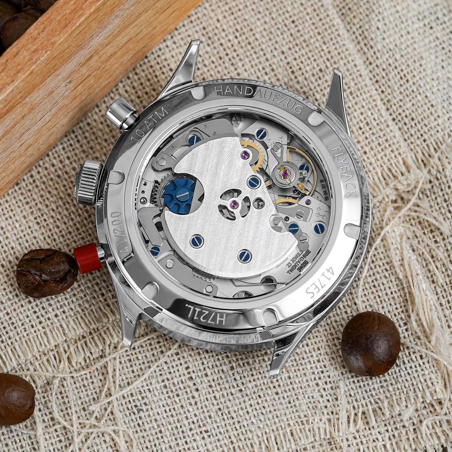The new 417 ES Mocha Flyback Date is powered by the Sellita AMT5100 M, a manually wound, column-wheel chronograph with flyback function. The movement operates at 28,800 vibrations/hour, delivers a 58-hour power reserve, and is adjusted in-house by Hanhart to an accuracy of 0 to +8 seconds per day, with a maximum delta of 10 seconds across six positions. The finishing is traditional and clean, visible through the sapphire caseback.