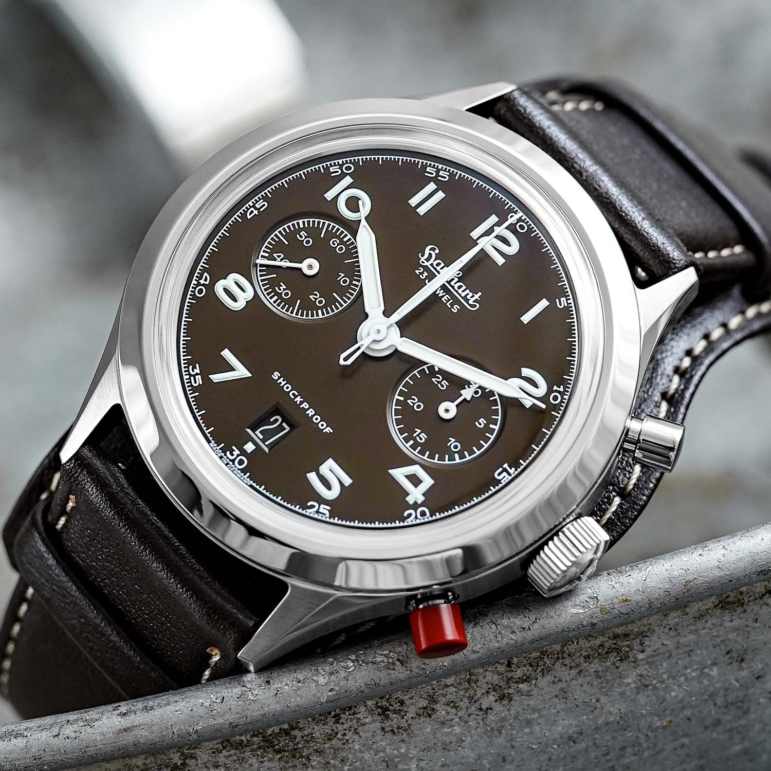 What hasn’t been removed, however, is the signature red HyCeram chronograph pusher, another Hanhart hallmark originally intended to prevent accidental reset of flight timings. Water resistance is rated to 100m, and both crystals, the domed front and display back, are sapphire with internal anti-reflective coating.