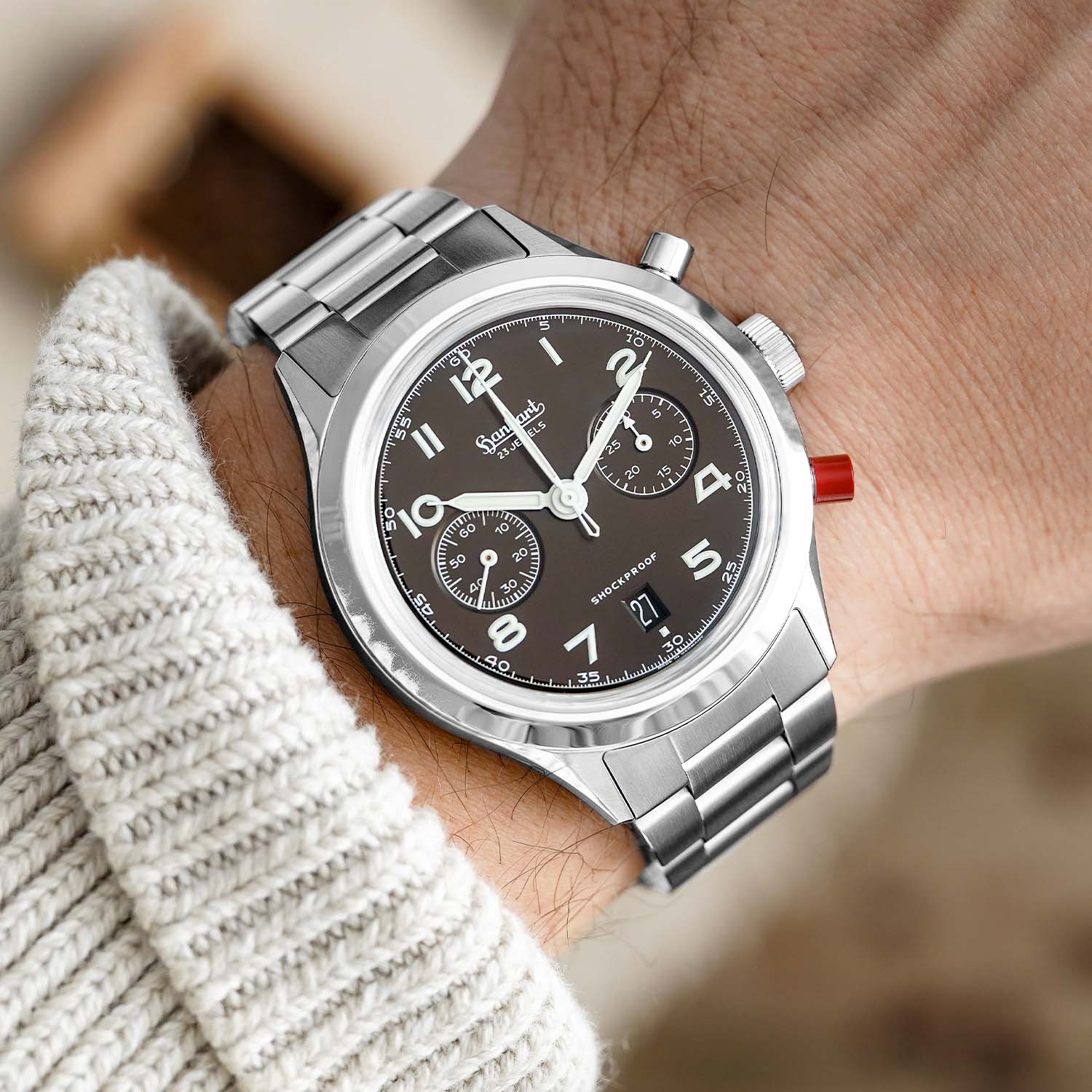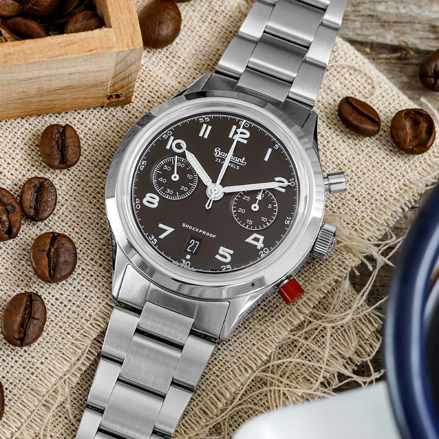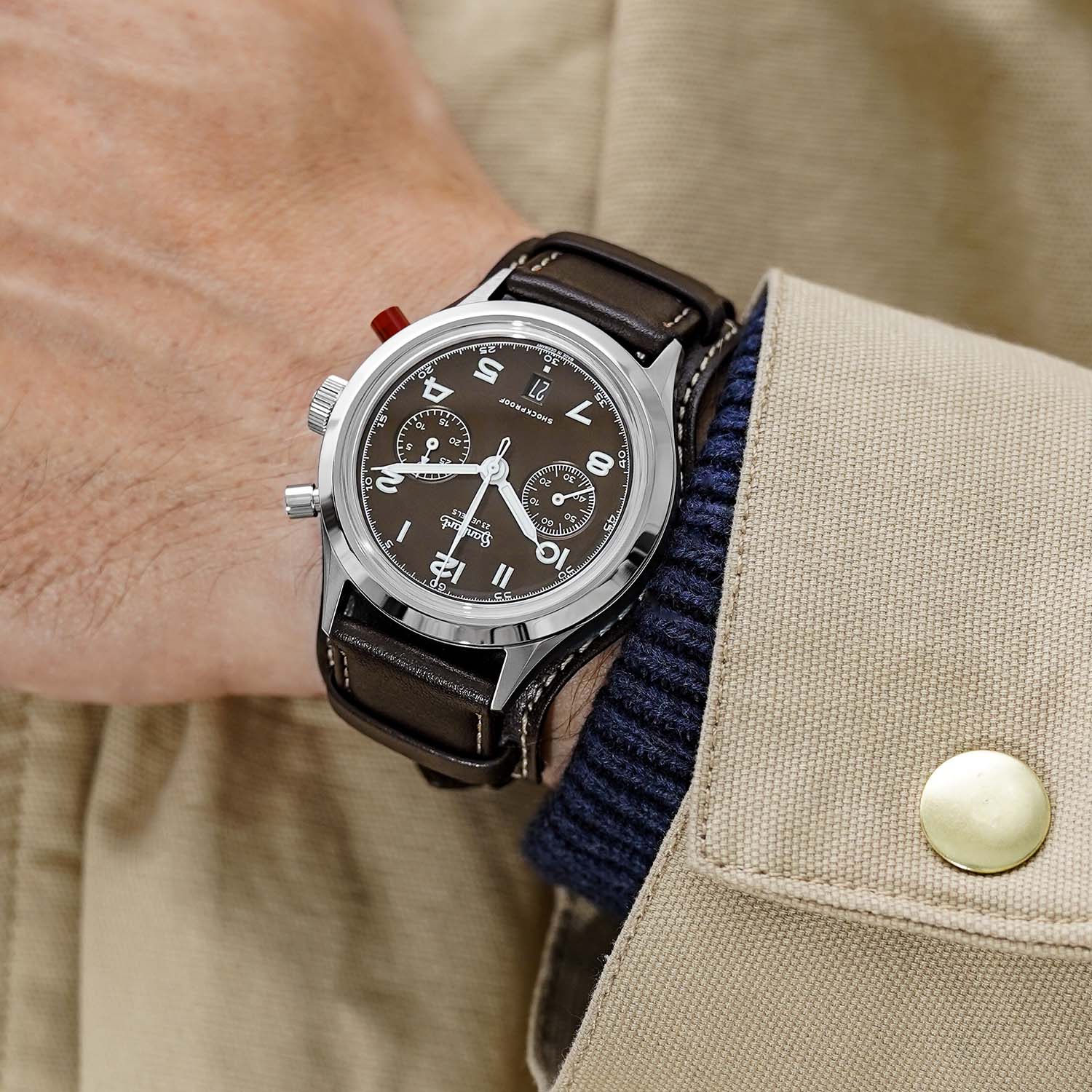 Like the standard edition, the new 417 ES Mocha Flyback Date features a 42mm stainless-steel case, combining brushed and polished surfaces for a balanced tool-meets-dress look. At 13.5mm thick and 49.8mm lug-to-lug, the proportions remain faithful to the military template but wear quite comfortably. As said, the fluted bezel, one of the most defining elements of the design of a Hanhart pilot’s chronograph, is gone, being replaced by a smooth, polished bezel, softening the appearance and giving the case a sleeker style.