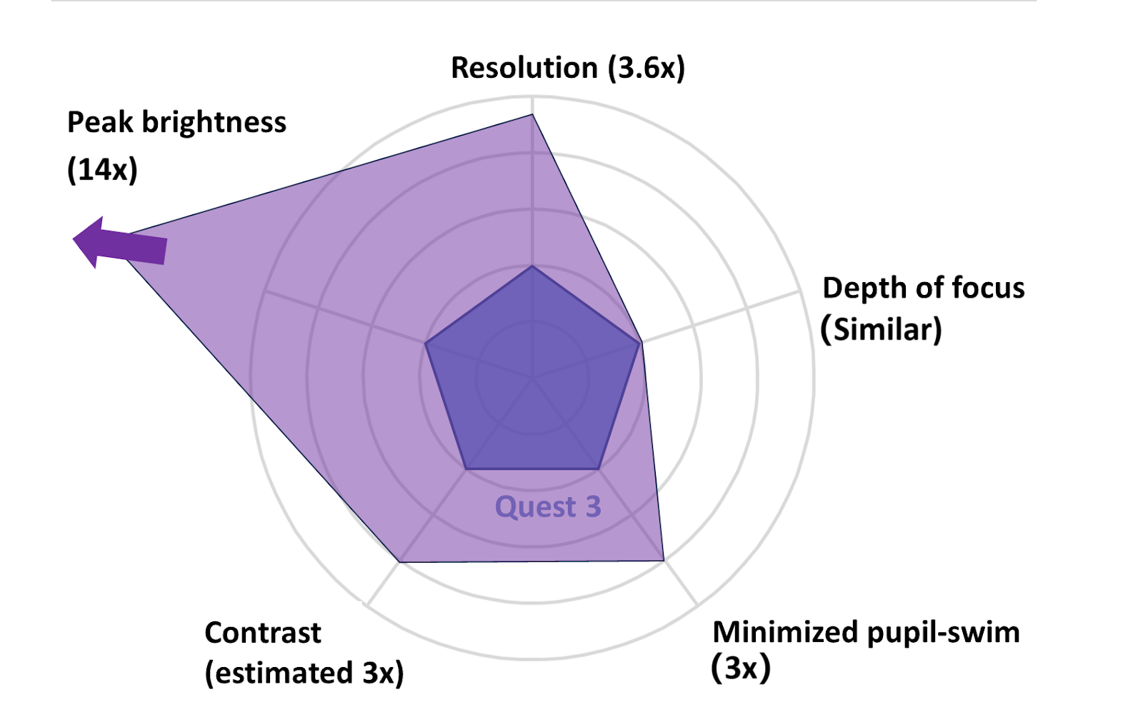 Tiramisu has an angular resolution of 90 PPD, a brightness of 1400 nits, and three times the contrast of Quest 3.