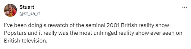 He shared: ‘I’ve been doing a rewatch of the seminal 2001 British reality show Popstars and it really was the most unhinged reality show ever seen on British television.’