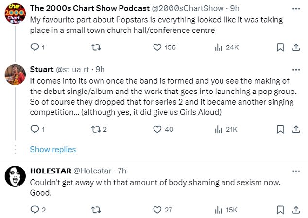 ‘My favourite part about Popstars is everything looked like it was taking place in a small town church hall/conference centre’; ‘Couldn’t get away with that amount of body shaming and sexism now. Good.’