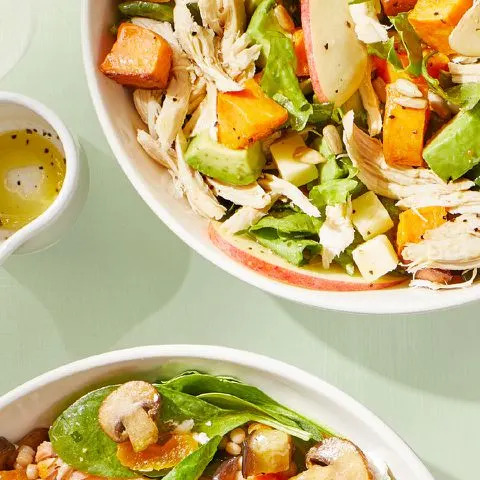 Prep four days’ worth of high-protein vegan lunches using just four easy ingredients. Because this salad mix is hearty, you can dress these bowls up to 24 hours before serving to allow the flavors in this healthy chopped salad to marry.