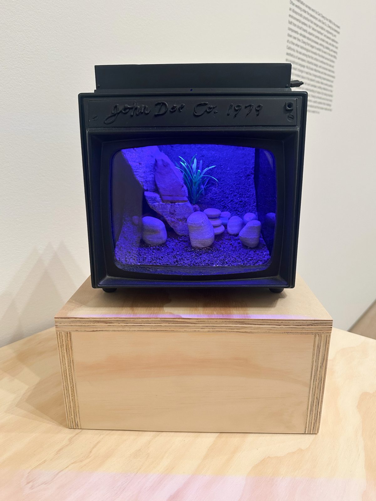 Carl Cheng, “Alternative TV #9” (1979–2016), plastic chassis, acrylic water tank, LED lighting and controller, electrical components, conglomerated rocks, and plastic plants