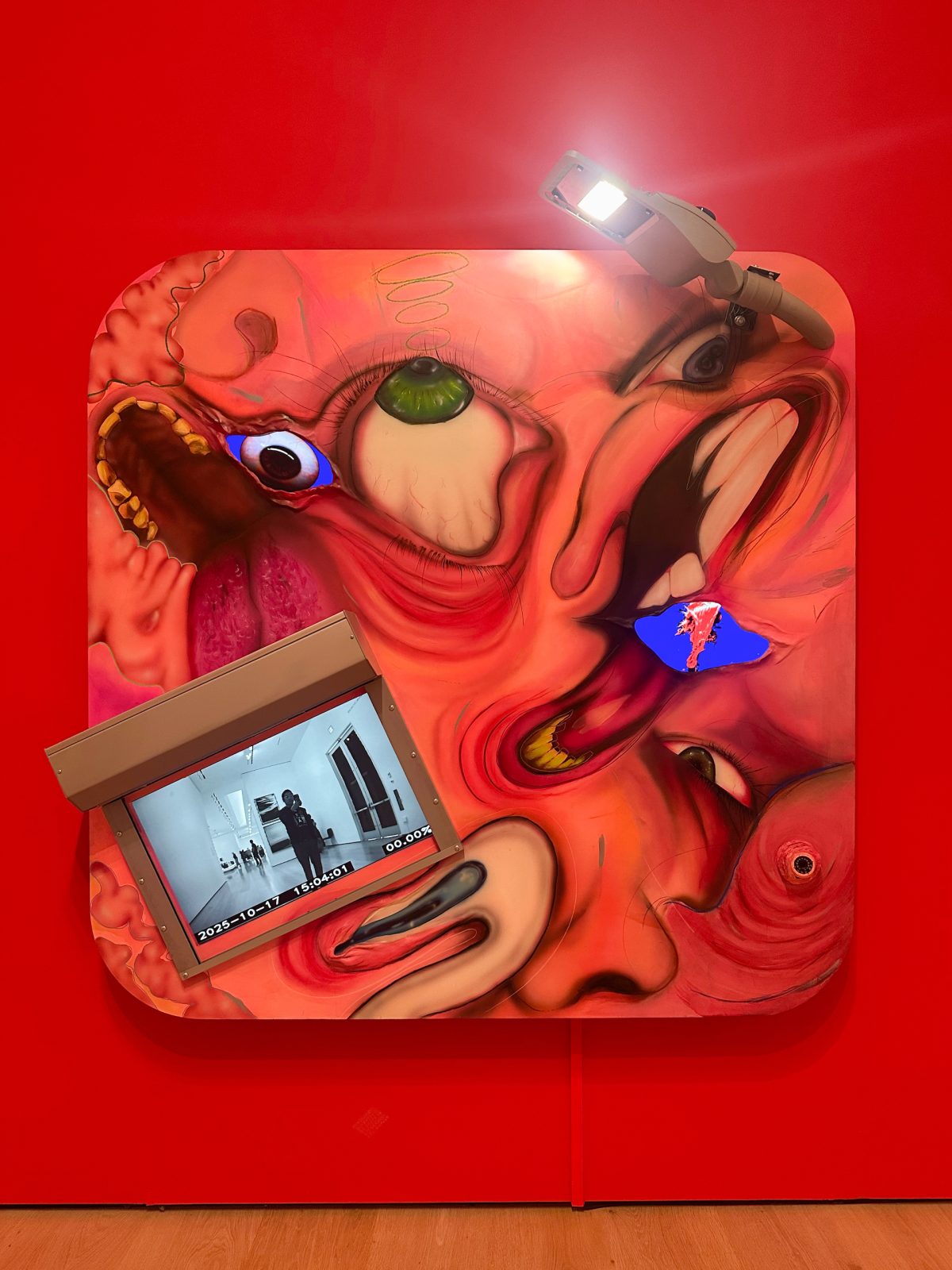 Another standout is an assemblage by Gabriela Ruiz comprised of cartoonishly painted screaming faces, a surveillance camera that displays the viewer on a screen, and an LED streetlamp. This piece perfectly embodies our fraught relationship with technology, wherein we willingly allow ourselves to be surveilled by social media platforms under the guise of connecting with others. These platforms have also manipulated and damaged our thought patterns, siloing us into our own personalized echo chambers and flattening commerce, memes, life milestones, and horrifying news clips into a single bland stream of content vying for our attention. The work is appropriately titled “Collective Scream” (2025).