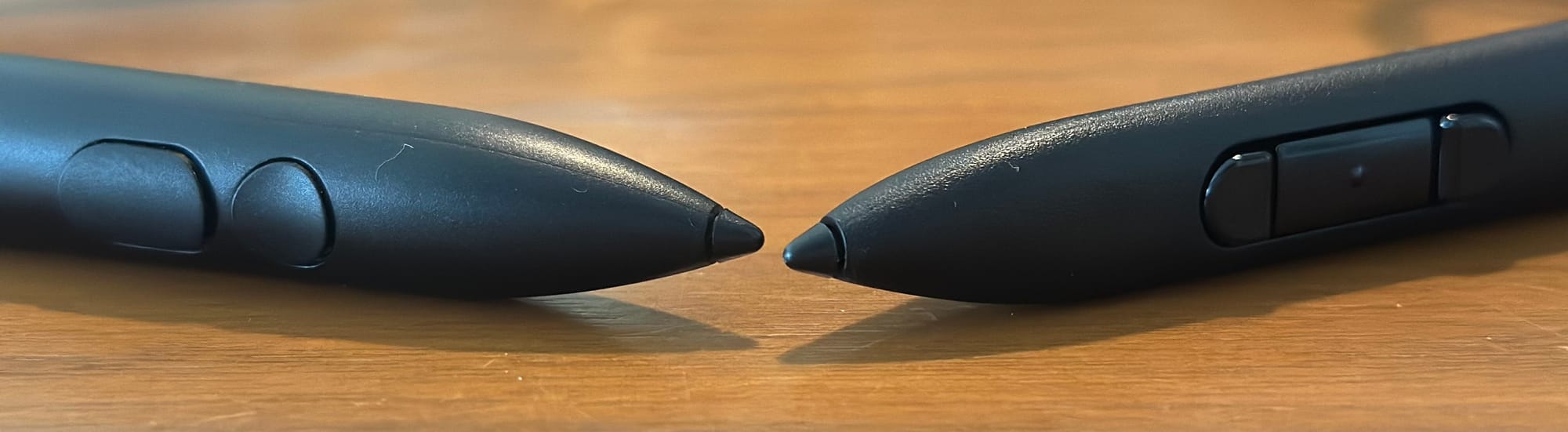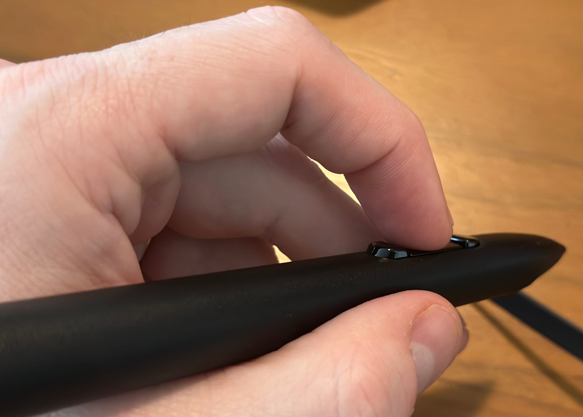 MX Ink with pressure-sensitive main button, as well as buttons behind and in front.