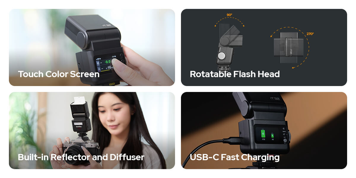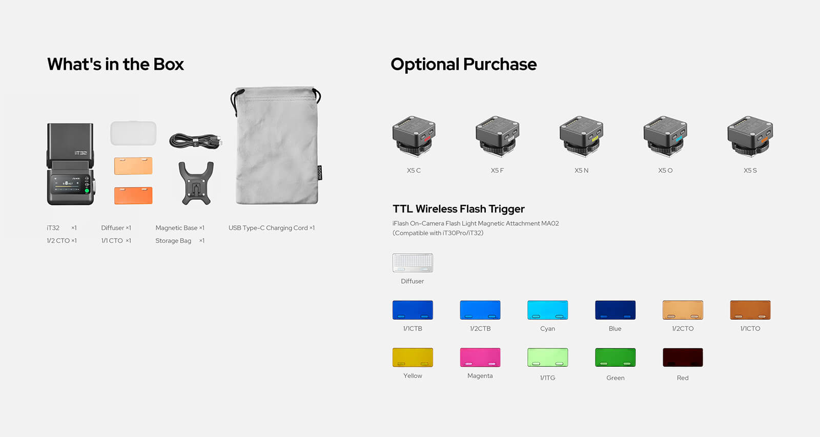 Meet the iT32 iFlash Camera Flash & X5 TTL Wireless Flash Trigger — a modular lighting system built for ultimate versatility and efficiency. When paired with different X5 versions, one iT32 flash body seamlessly adapts to Canon, Nikon, Sony, Fujifilm, and OM System cameras, offering full TTL and HSS support across brands. The X5 functions as both a hotshoe and wireless trigger, enabling instant transitions between on-camera use, off-camera freedom, and complex multi-light setups. Compact yet powerful, the iT32 & X5 combine magnetic modularity, cross-brand compatibility, and Godox 2.4GHz wireless integration—empowering photographers to shape light effortlessly, anytime and anywhere.