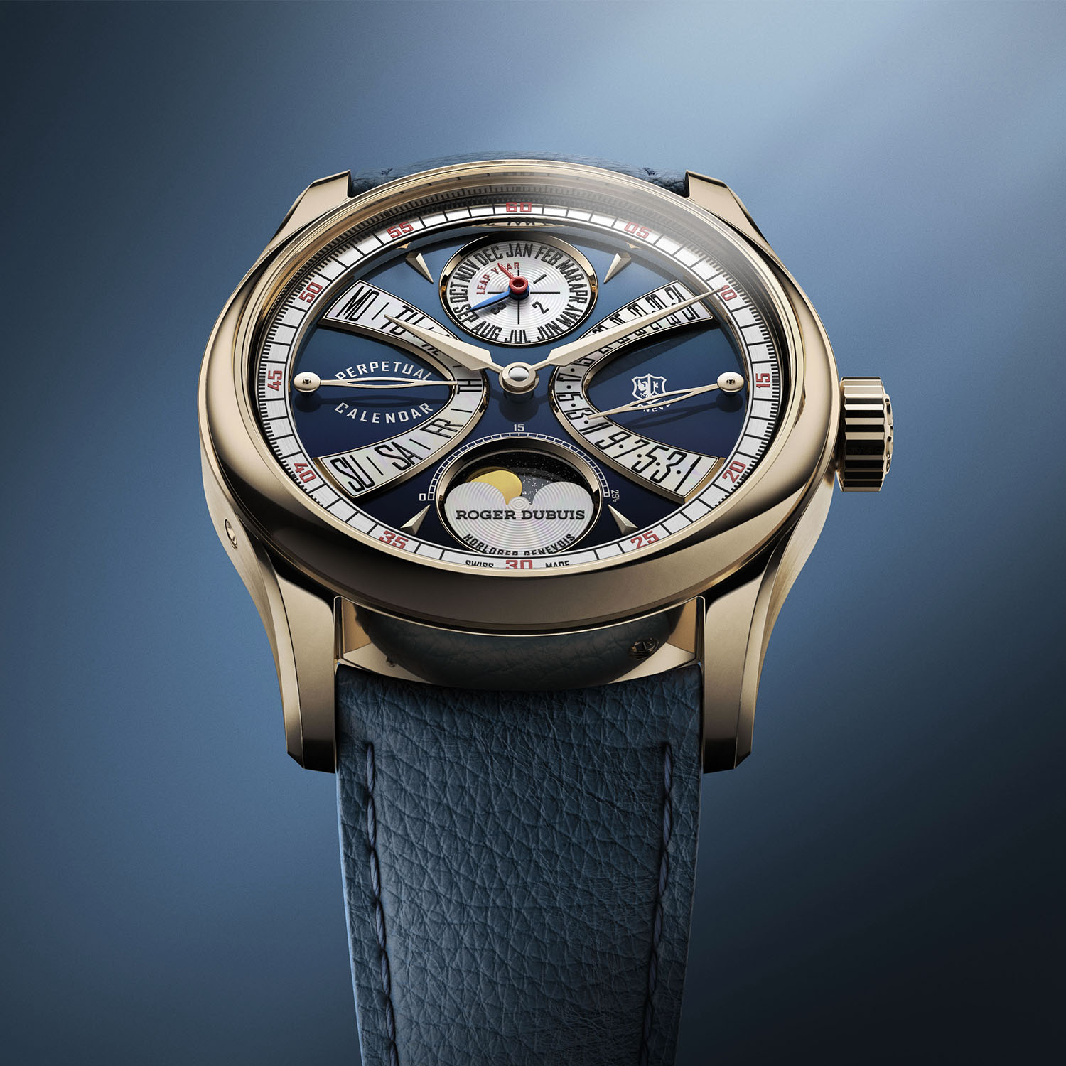 The dial of this Roger Dubuis Hommage La Placide couldn’t be more RD, with its Biretrograde display for the perpetual calendar. The blue lacquered main plate is complemented by a circular brushed flange and mother-of-pearl calendar segments for the retrograde indications of the day and date. The months and leap year at 12 and the moon at 6 o’clock are also using MoP with a broader circular-brushed finish, and the gold moon sits atop an aventurine disc. This perpetual calendar display is made possible thanks to the RD72 module, first used in 1999. While using a known technical base, the main plate, large bridge, and 50% of the components, such as levers, springs, wheels, and pinions, had to be remanufactured.
