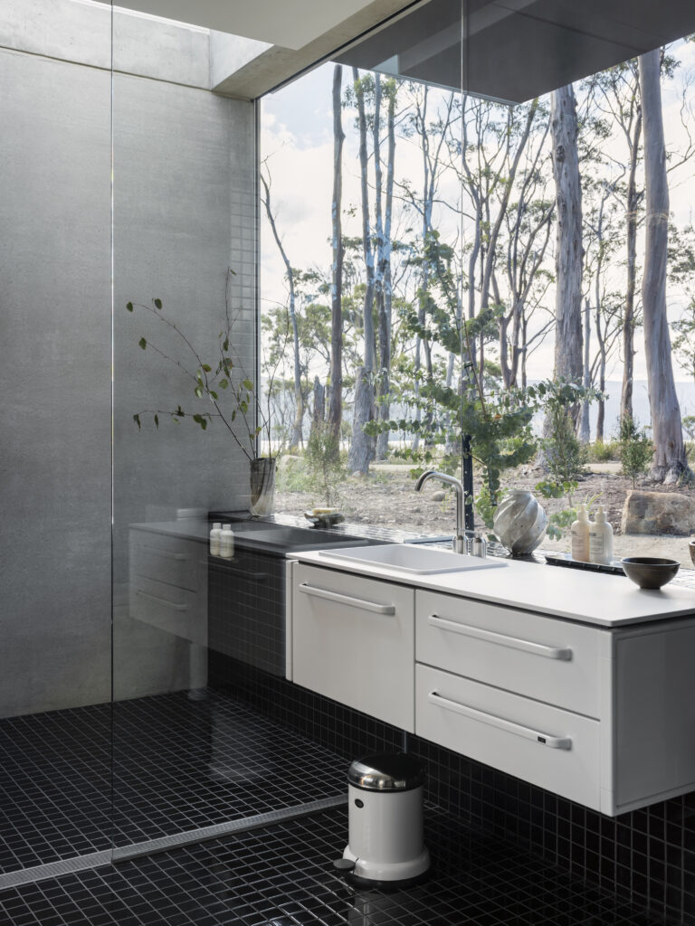 The Vipp Tunnel stretches 30 metres across sloping terrain, with wall-to-wall glass providing unobstructed views of the D’Entrecasteaux Channel and Tasmanian mountains. The brutalist structure, designed by Hobart-based Room11, balances on the edge between solid ground and open air whilst operating completely off-grid.