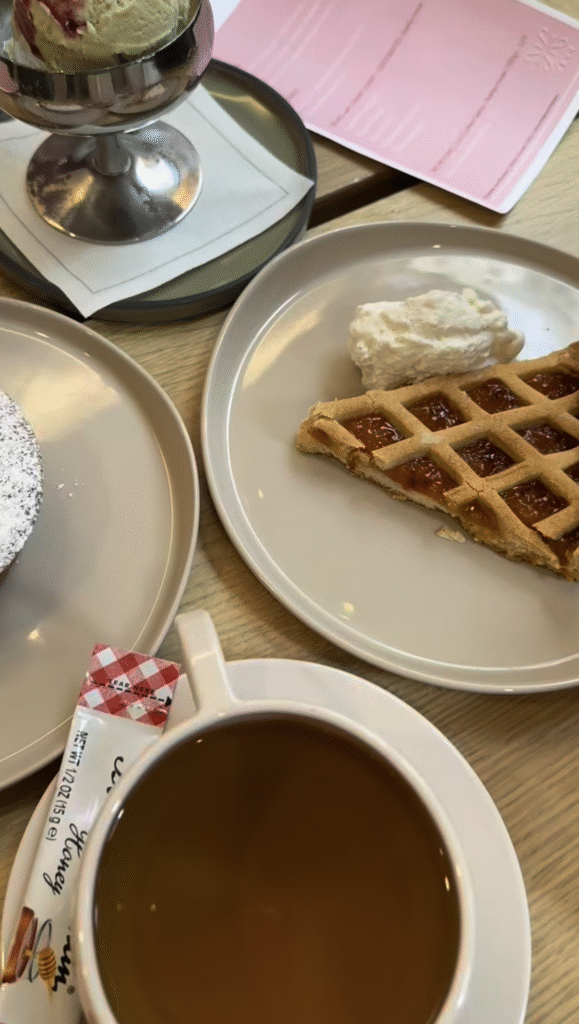 Libbi’s beverage menu includes house cocktails like the Olive Oil Martini, Raspberry Paper Plane, and a Shiso Mojito—each priced at $21. Soft drinks include imported Moshi sparkling sodas, and juices like Cold Pressed Cara Cara Orange Juice ($9). Espresso, cappuccinos, iced lattes, and a thoughtful list of teas round out the drinks section.