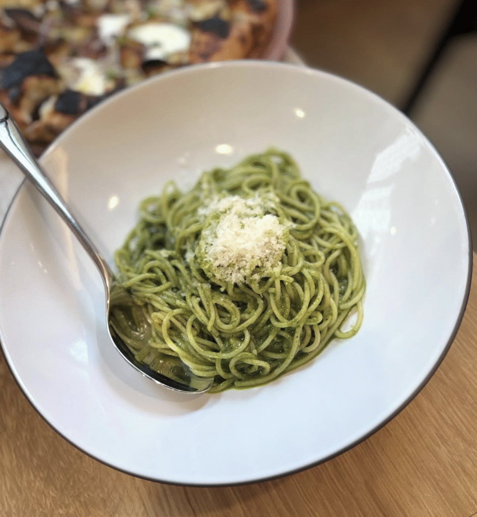 - Spaghetti with English peas pesto, yogurt, lemon zest, and pecorino ($29)