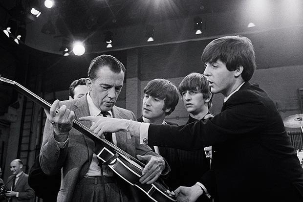 Paul McCartney shows Ed Sullivan his guitar during a rehearsal for the debut of the Beatles on “The Ed Sullivan Show” on February 9, 1964. File photo by UPI