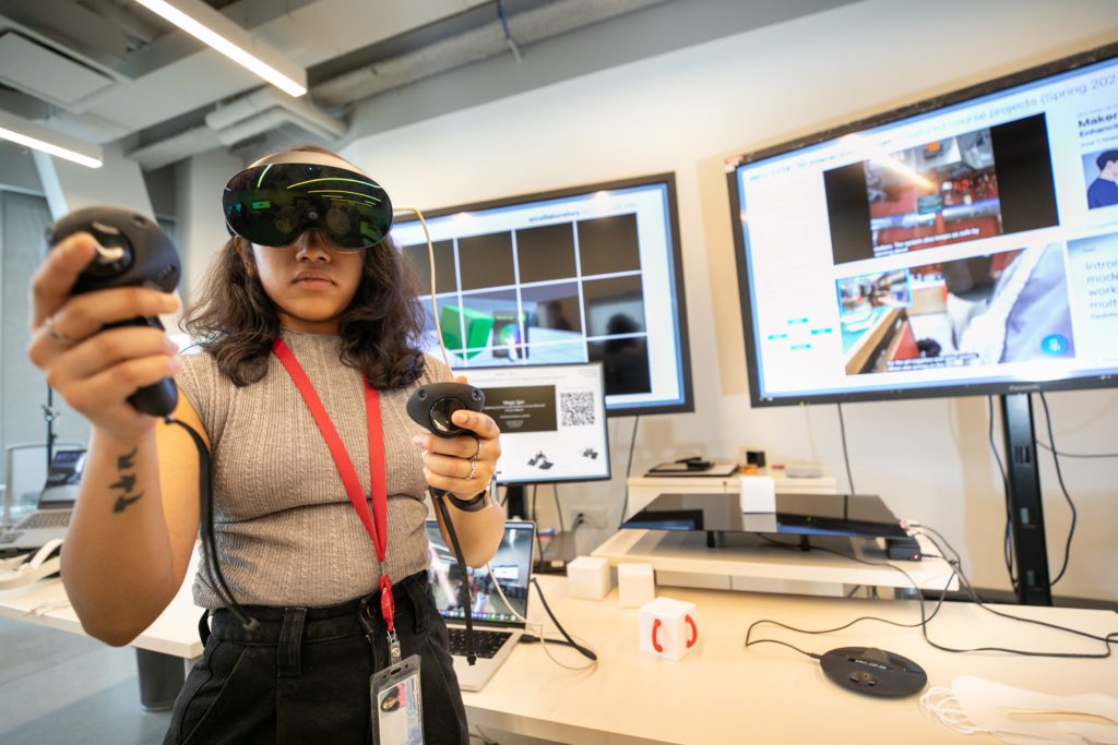 A student presents their VR project in the XR Collaboratory during Cornell Tech’s Startup Awards + Open Studio 2025