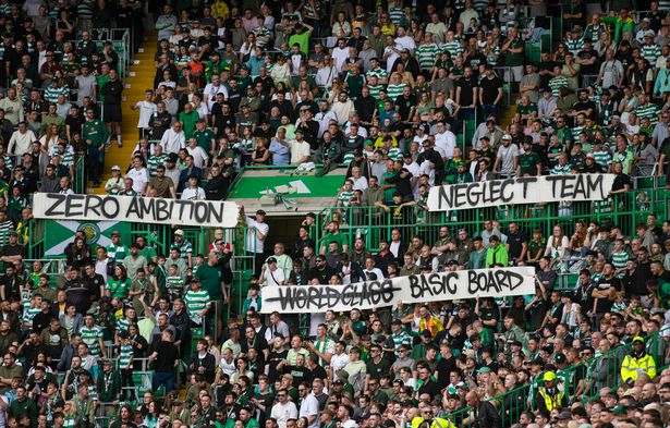 The Green Brigade followed up Tuesday’s attack on the Parkhead board with another round of pot shots as their team struggled to find a breakthrough. It took until the 13th minute for the first of three chants of ‘sack the board’ which was accompanied by a banner screaming ‘Zero ambition. Neglect team. Rinse fans. Basic board’. With the words world class scribbled out and replaced by Basic.