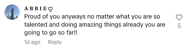 ‘Proud of you anyways no matter what you are so talented and doing amazing things already you are going to go so far!!’;