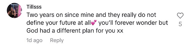 ‘Two years on since mine and they really do not define your future at all. You’ll forever wonder but God had a different plan for you xx’;