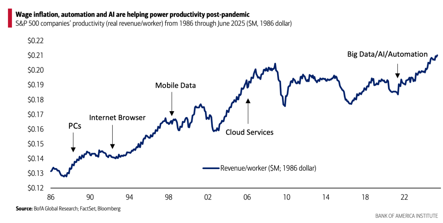 This means companies are learning to do more with less, and that is kind of magical. Companies have had to do harder work to generate earnings and keep margins healthy, often by replacing their people with processes. “A process is almost free and it’s replicable for eternity,” she said, adding that she thinks this is why the companies exercising efficiency gains have tended to outperform. It’s not only about AI displacing workers, but a fundamental shift in how business is being done.