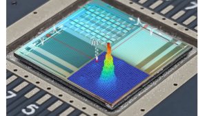 The superconducting microwire single-photon detector, or SMSPD, – the small dark purple region – can precisely detect single particles at a time. The detectors were designed and fabricated at JPL and commissioned at the INQNET-Caltech labs