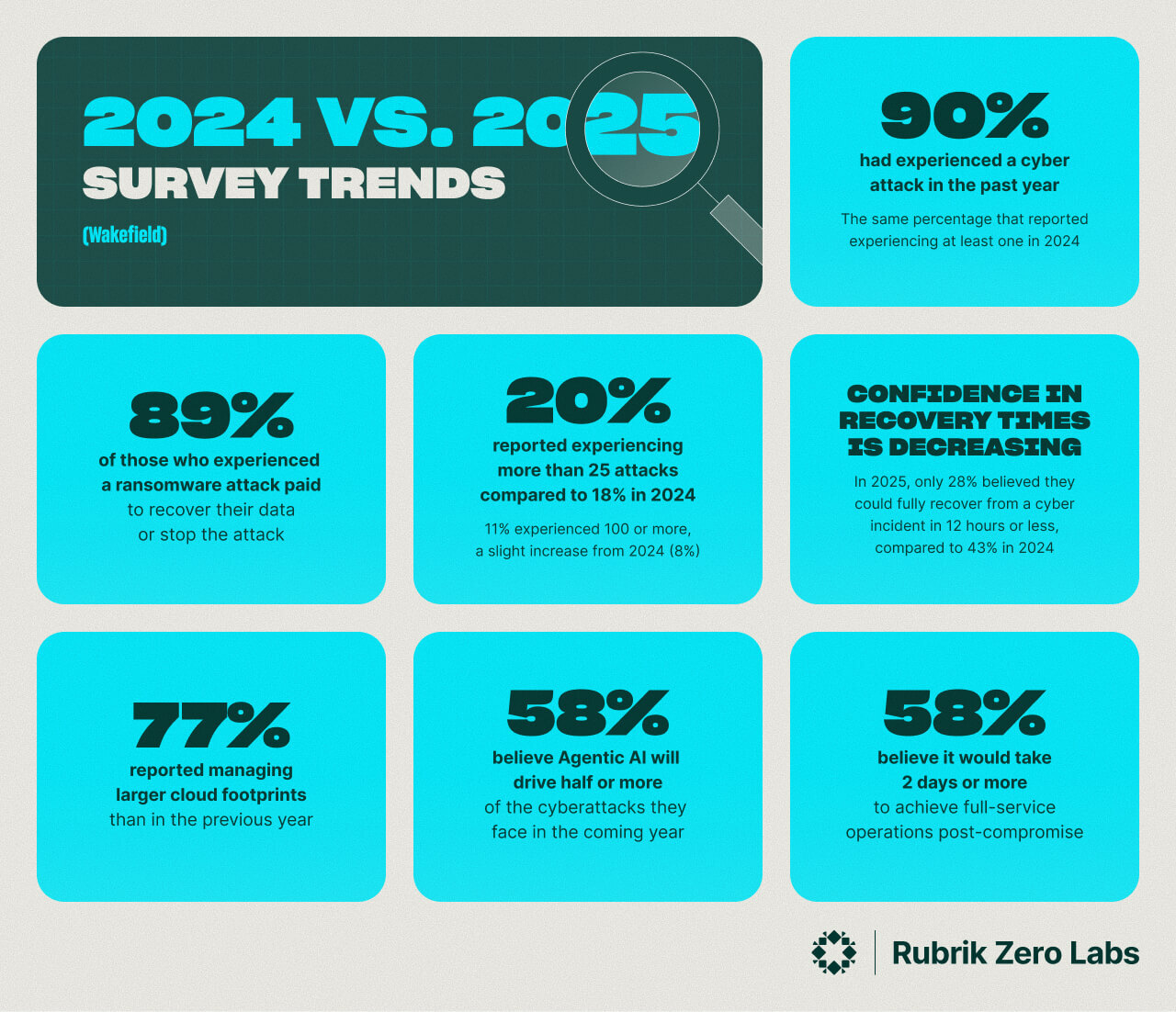 They’re also less confident in their resiliency: with only 28% believing they could fully recover from a cyber incident in 12 hours or less, compared to 43% in 2024. And looking ahead, 58% of those surveyed believe that agentic AI will drive half or more of the cyberattacks that they face in the coming year.