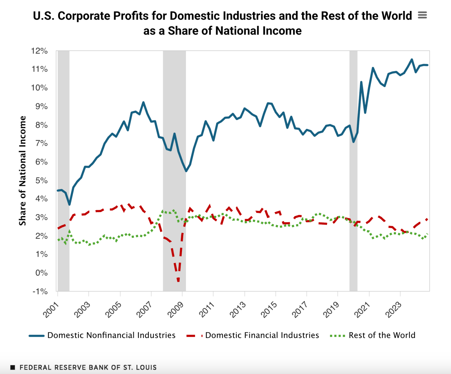 The consequence of this money printing and fiscal expenditure was a “bonanza for the corporate sector,” resulting in corporate profit margins soaring “off to infinity” after the pandemic. Edwards noted specific sectors benefited enormously, recalling a St. Louis Fed study that showed corporate profits as a share of national income surging as a share of national income since the inflation spike, a total outlier compared to the rest of the world.