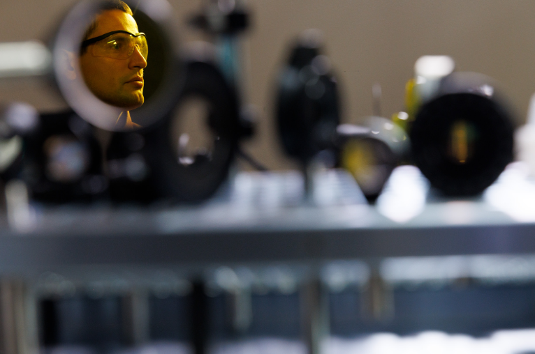 Demid Sychev, a postdoctoral researcher in Shalaev’s group and the first author of this paper, is seen in the reflection of one of many mirrors in Shalaev’s nanophotonics laboratory.