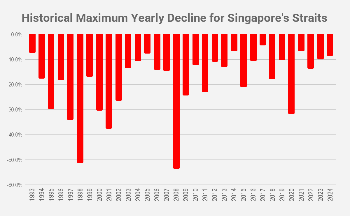For instance, between 2003 and 2007, and again from 2016 to 2019, the STI did not experience a single 20 per cent decline.