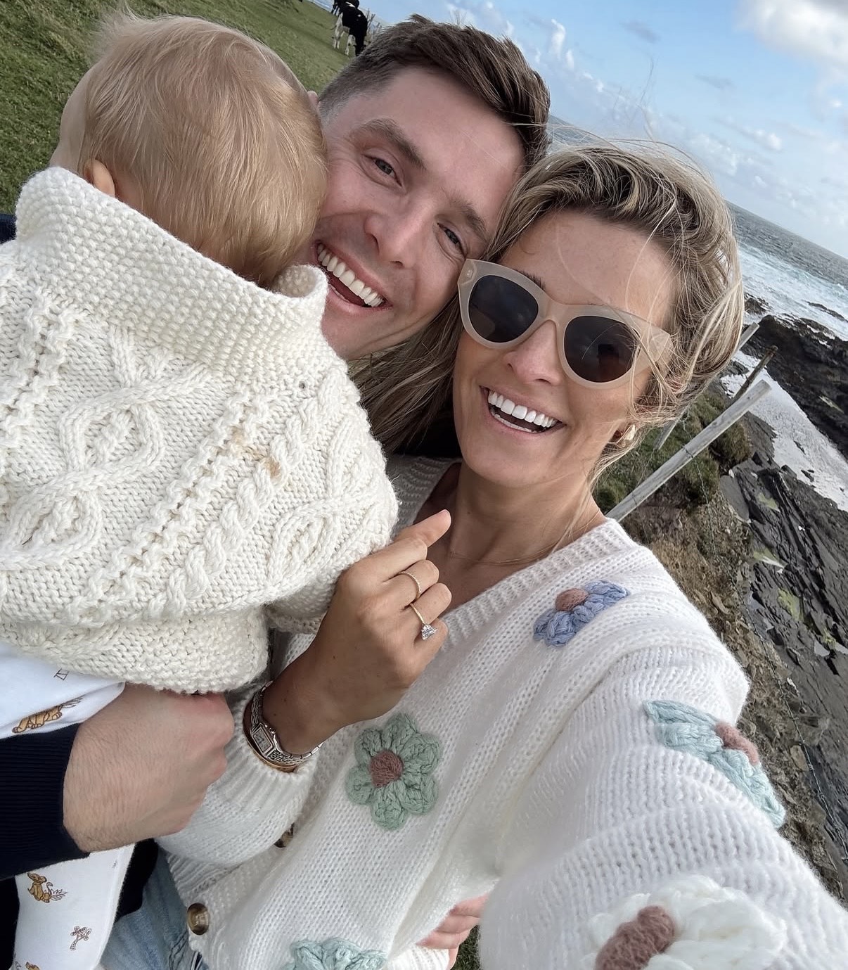 Louise and Mark pictured after getting engaged alongside baby Jude who was present for the landmark day