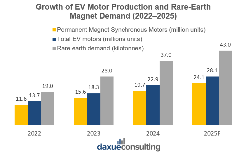 Data source: Benchmark Mineral Intelligence, designed by Daxue Consulting, Growth of EV Motor Production and Rare-Earth Magnet Demand from 2022 to 2025Growing dependence of EV motors on China’s rare-earth manufacturing capacity