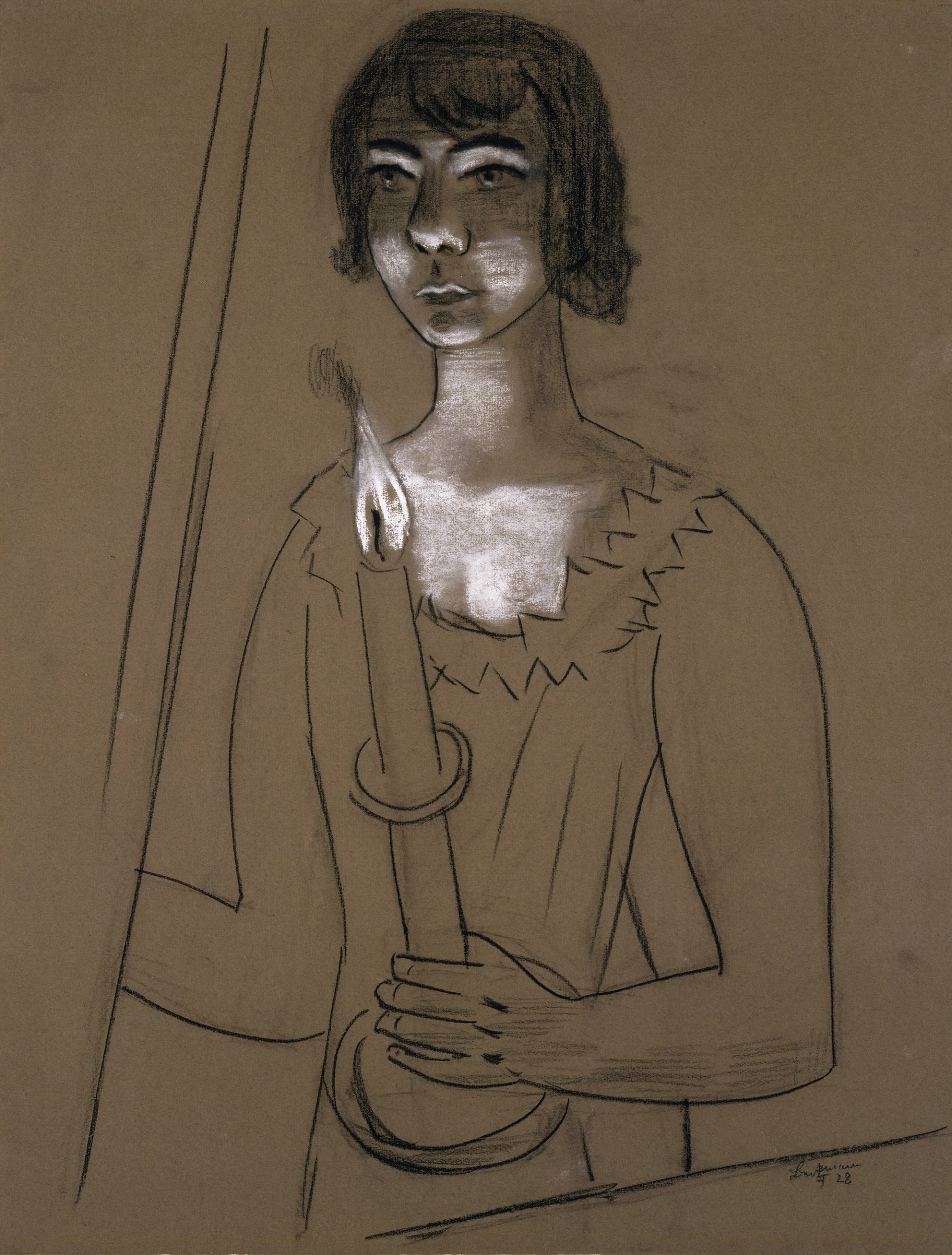 In 1925, Beckmann divorced his first wife, the opera singer Minna Tube, and married the Bavarian-born Mathilde “Quappi” von Kaulbach, who became his lasting muse. In a 1928 drawing of Quappi holding a candle, the artist vividly captures the effect of light on her face and chest by using little more than chalk and pencil on cardboard.