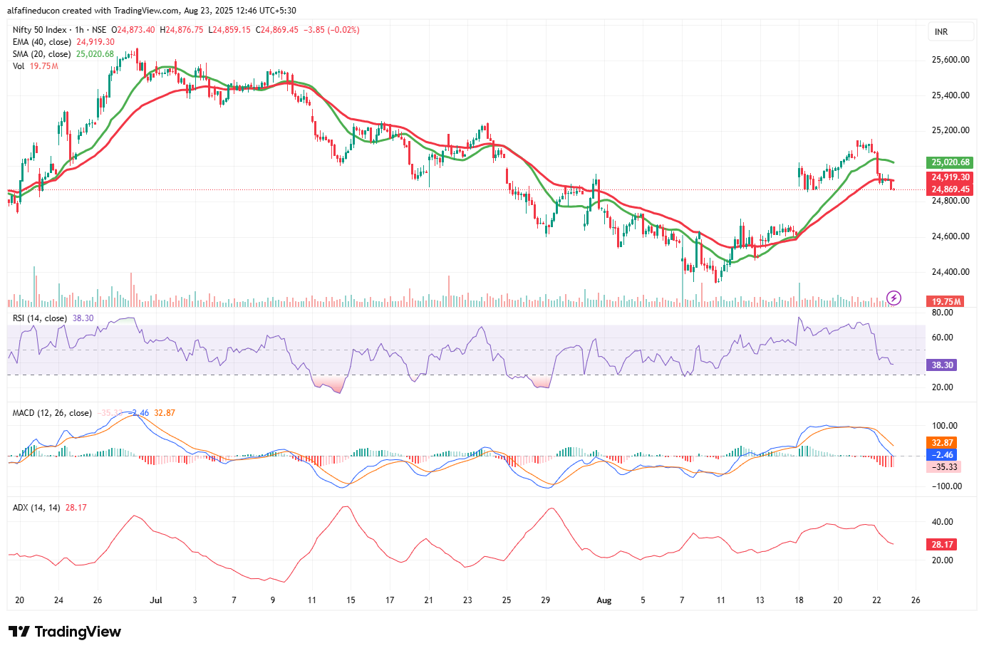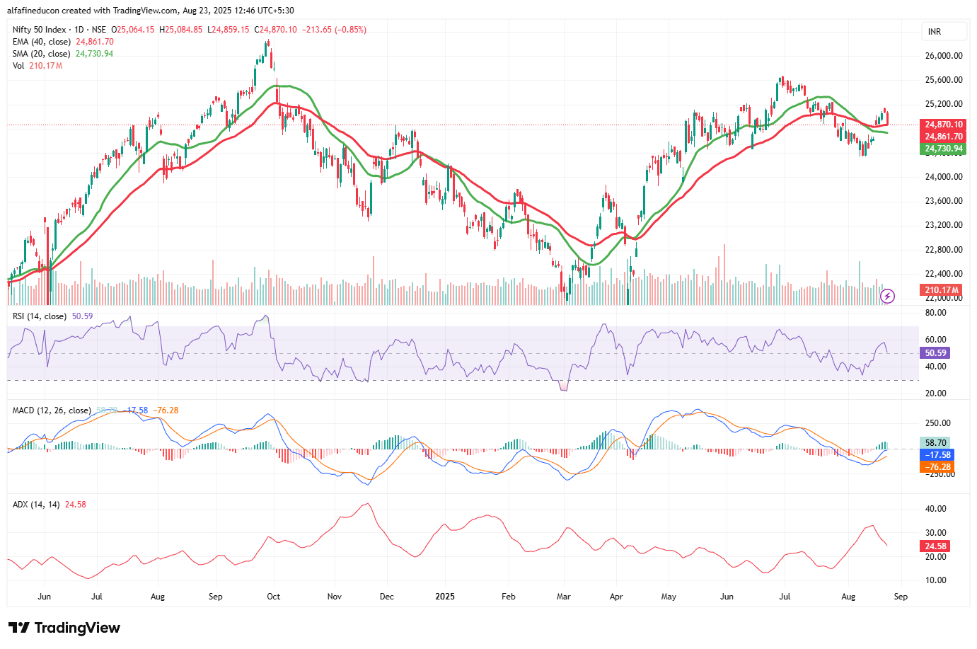 The Nifty 50 ended the session on 22nd August 2025 under pressure, slipping below the 25,000 zone as weak momentum and bearish derivative positioning weighed on sentiment. The index is now showing signs of fatigue after its recent consolidation, with technical and OI data hinting at further volatility in the upcoming session.