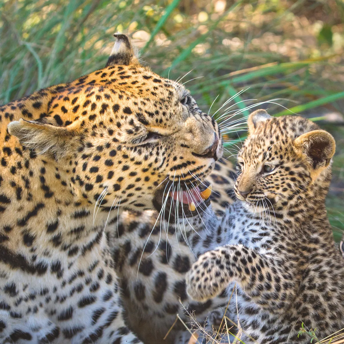 Females may summon cubs from their hiding place with a faint call, if the coast is clear. Here, at four months old, the cubs appear delighted to see their mother, greeting her with exuberant nuzzles. Suzi Eszterhas