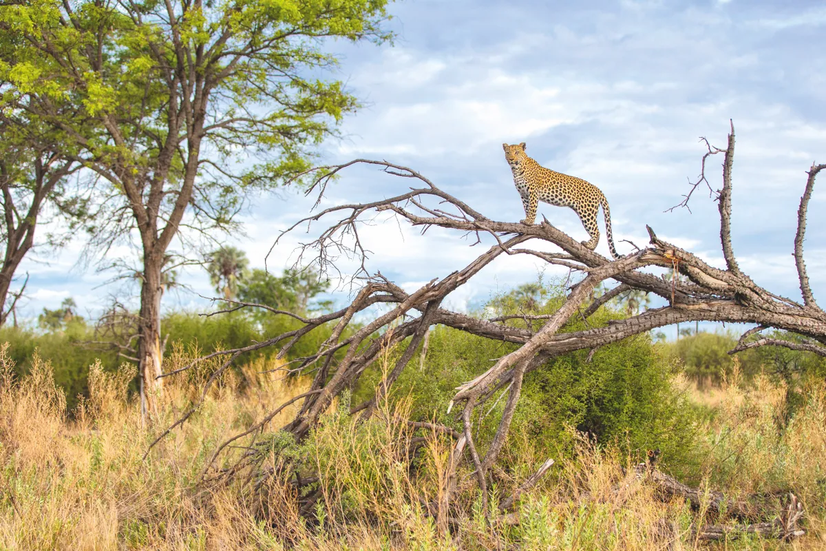 Ever watchful for predators such as baboons and lions, Camp Female scours the landscape from atop a dead tree. Leopards are thought of as nocturnal, but will hunt in the day if the opportunity arises. Suzi Eszterhas