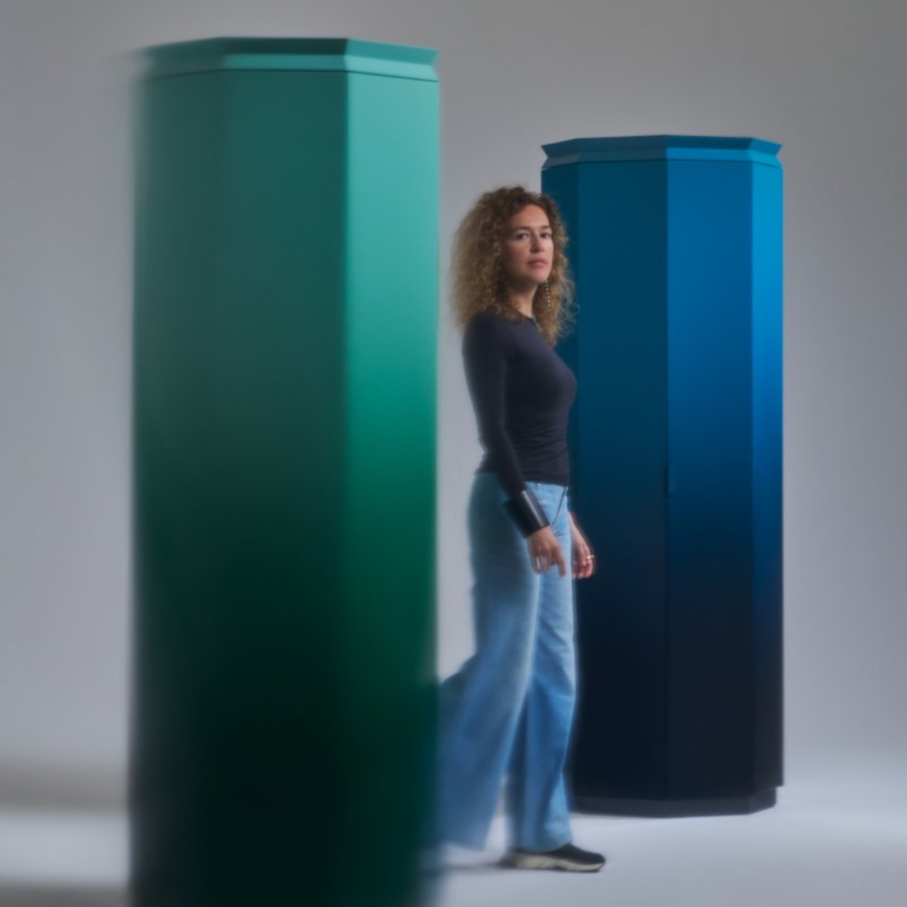 When closed, Ottagono reads like a sculptural floor lamp rather than a cabinet full of kettlebells. The exterior is finished in gradient tones, deep blue fading lighter toward the top or emerald green transitioning upward, with clean facets and minimal seams. At its summit, an integrated uplight washes the ceiling in soft ambient glow. In a living room or suite, it sits quietly under that halo, looking more like art than utility, which seems to be exactly what Foscari and Cassina intended.