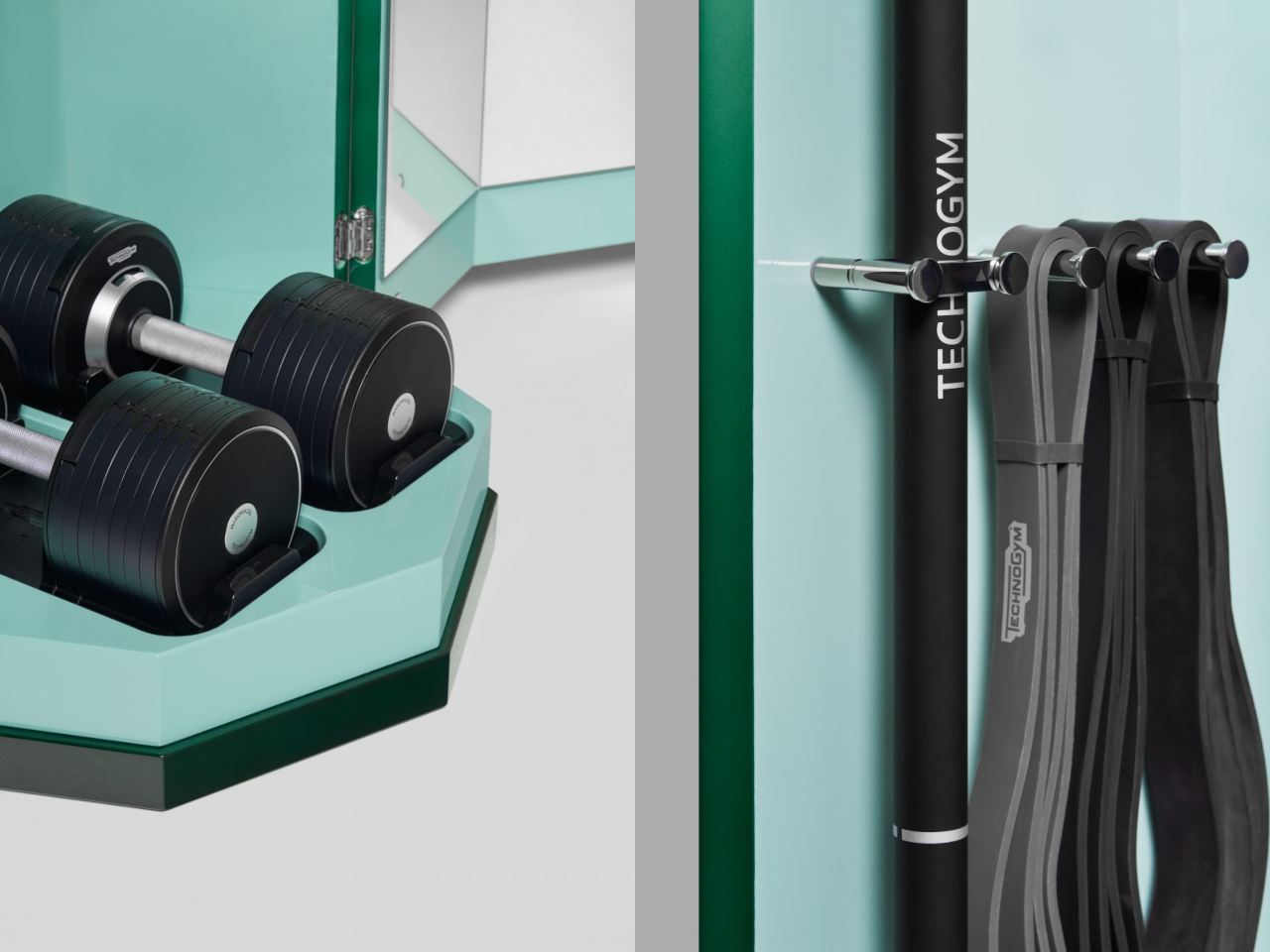 Open the doors, and the mood shifts completely. The interior glows in bright turquoise, with a vertical screen at eye level streaming Technogym workouts and a mirror on one door for checking form. Adjustable dumbbells nestle into octagonal cradles at the base, kettlebells hang on polished hooks, resistance bands drape from pegs, and a foam roller stands vertically alongside mobility balls. Foscari calls it “opening a room within a room,” which feels accurate because the inside genuinely reads like a micro gym carved from a single piece of furniture.