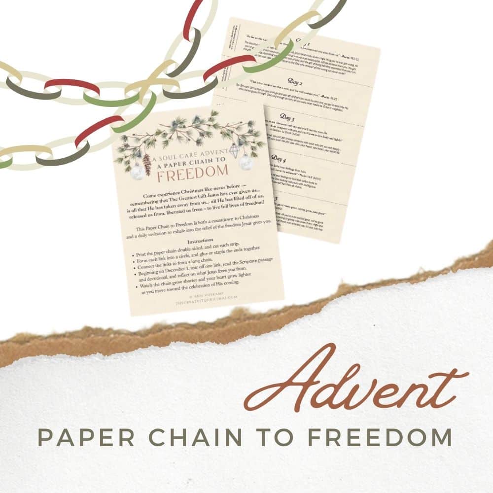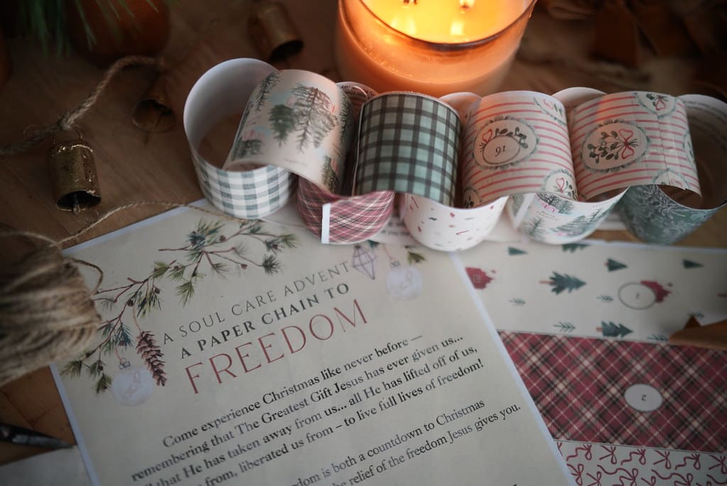 This Paper Chain to Freedom is your own FREE ADVENT CALENDAR that is both a countdown to Christmas — and a daily invitation to reflect on that day’s Bible verse to fully experience the freedom Jesus brings to have a lighter, freer Christmas!