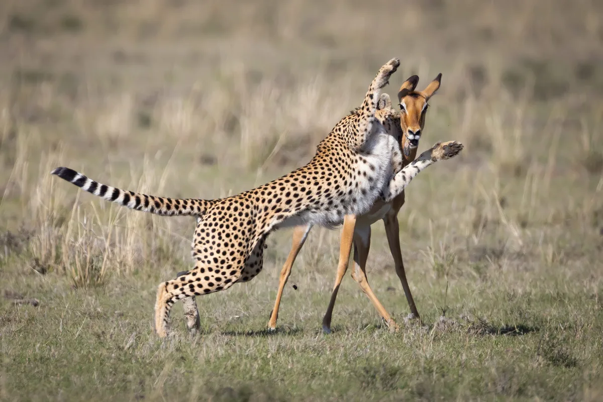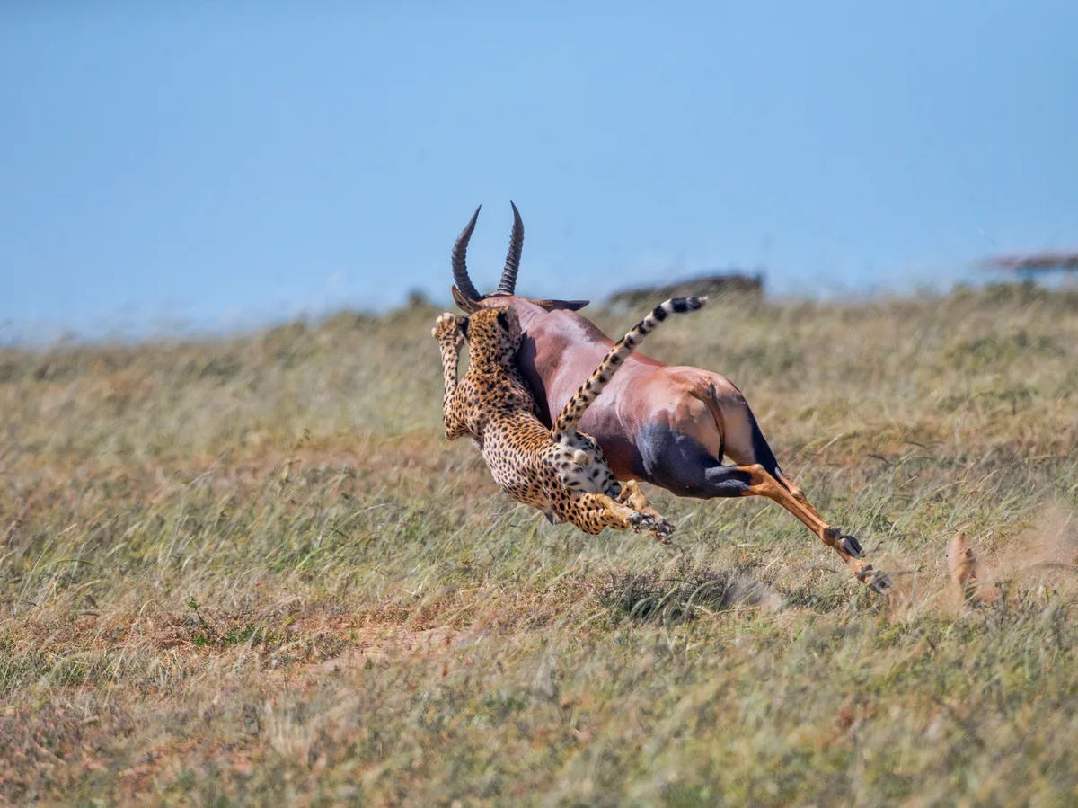 A male cheetah attempts to bring down a topi antelope in the Maasai Mara. Credit: Getty Images