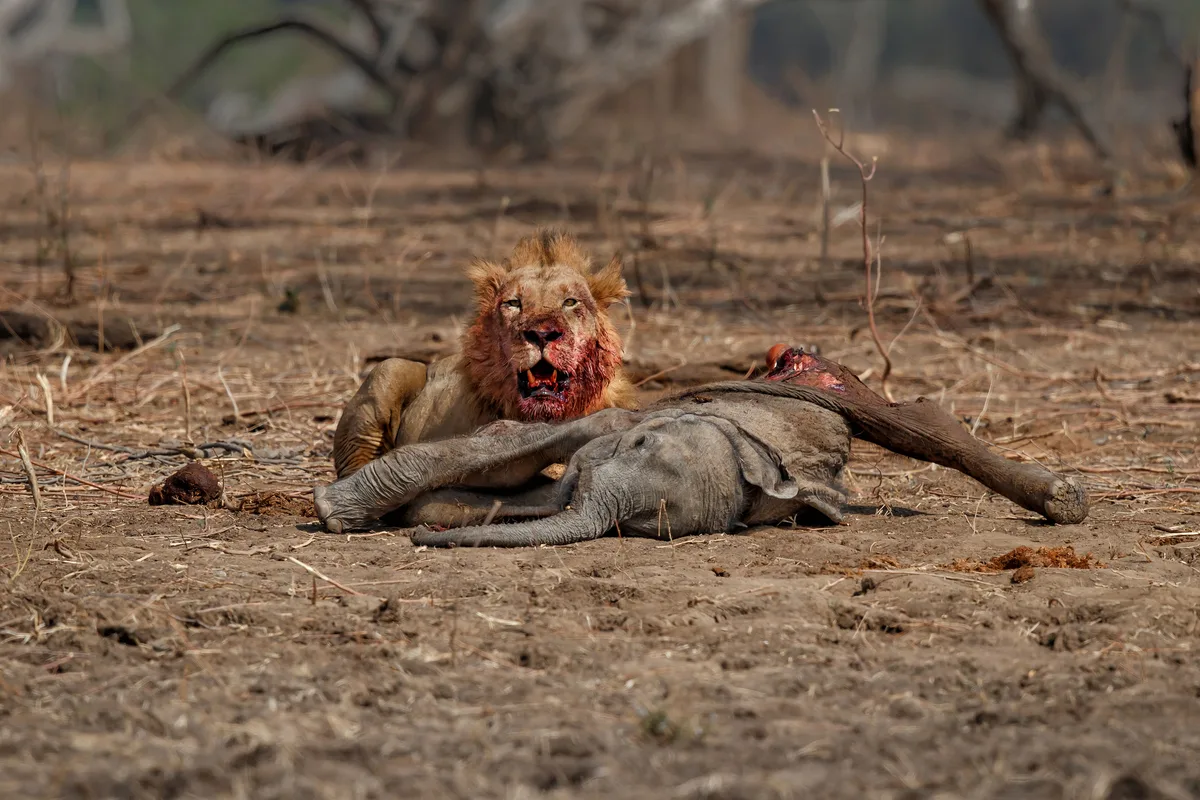 African lion with an African elephant calf kill in Mana Pools National Park, Zimbabwe. Lions rarely hunt elephants due to their immense size and strength. Calves, however, can be vulnerable if separated from the herd. Credit: Getty Images