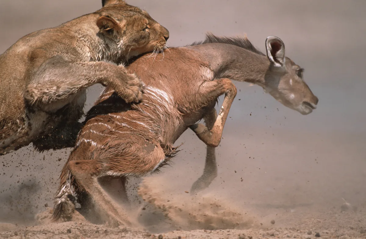 A lioness attacks a kudu in Etosha National Park, Namibia. Once she brings the kudu down, the rest of the pride will join to feed. Credit: Getty Images
