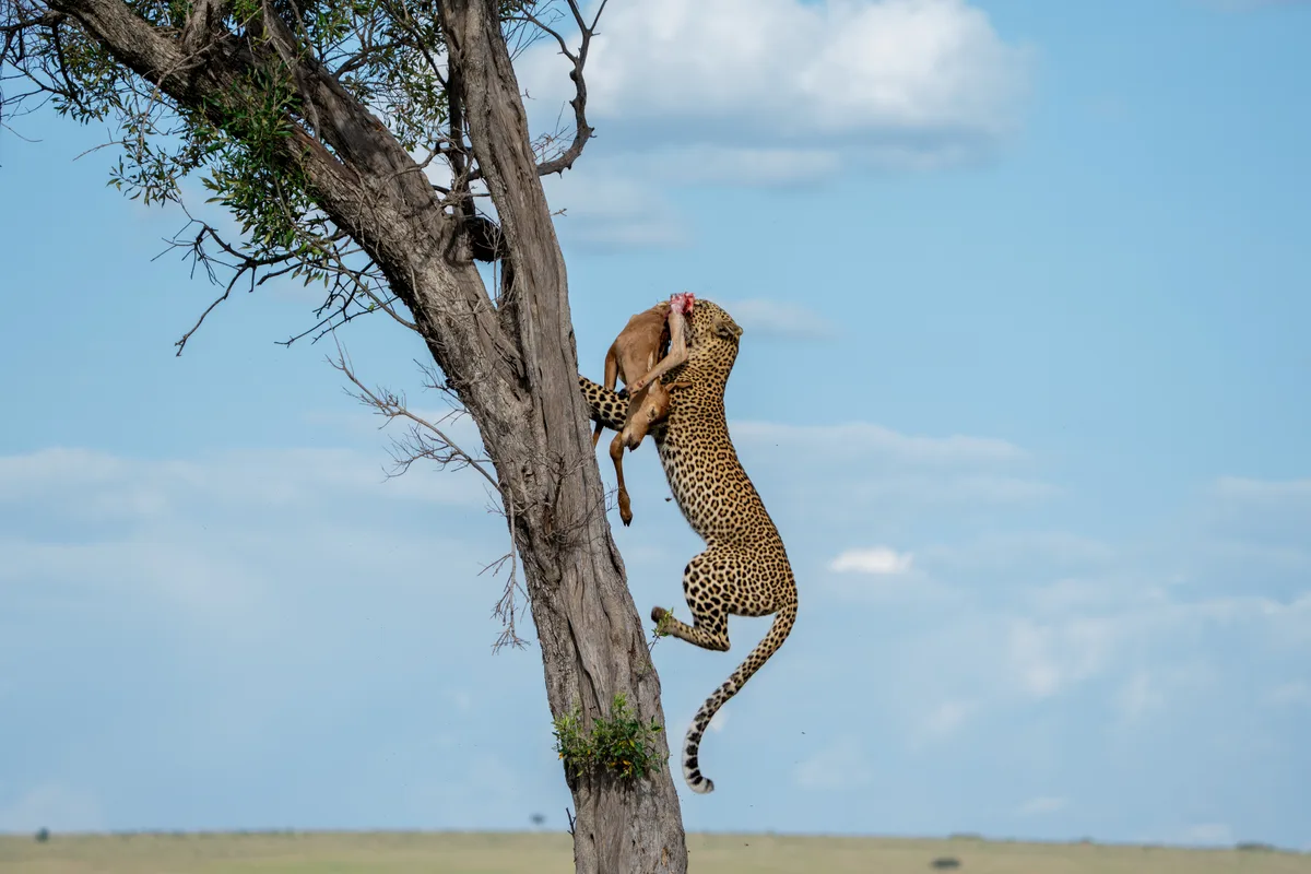 A leopard carries her topi kill up a tree in Kenya’s Maasai Mara. It’s classic behaviour that protects the meal from scavengers, such as hyenas and lions. Credit: Getty Images