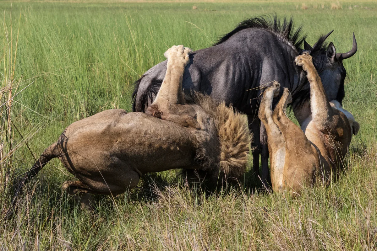 Lions often target wildebeest during their migrations, using bursts of speed and strength to bring down these large animals. Credit: Getty Images