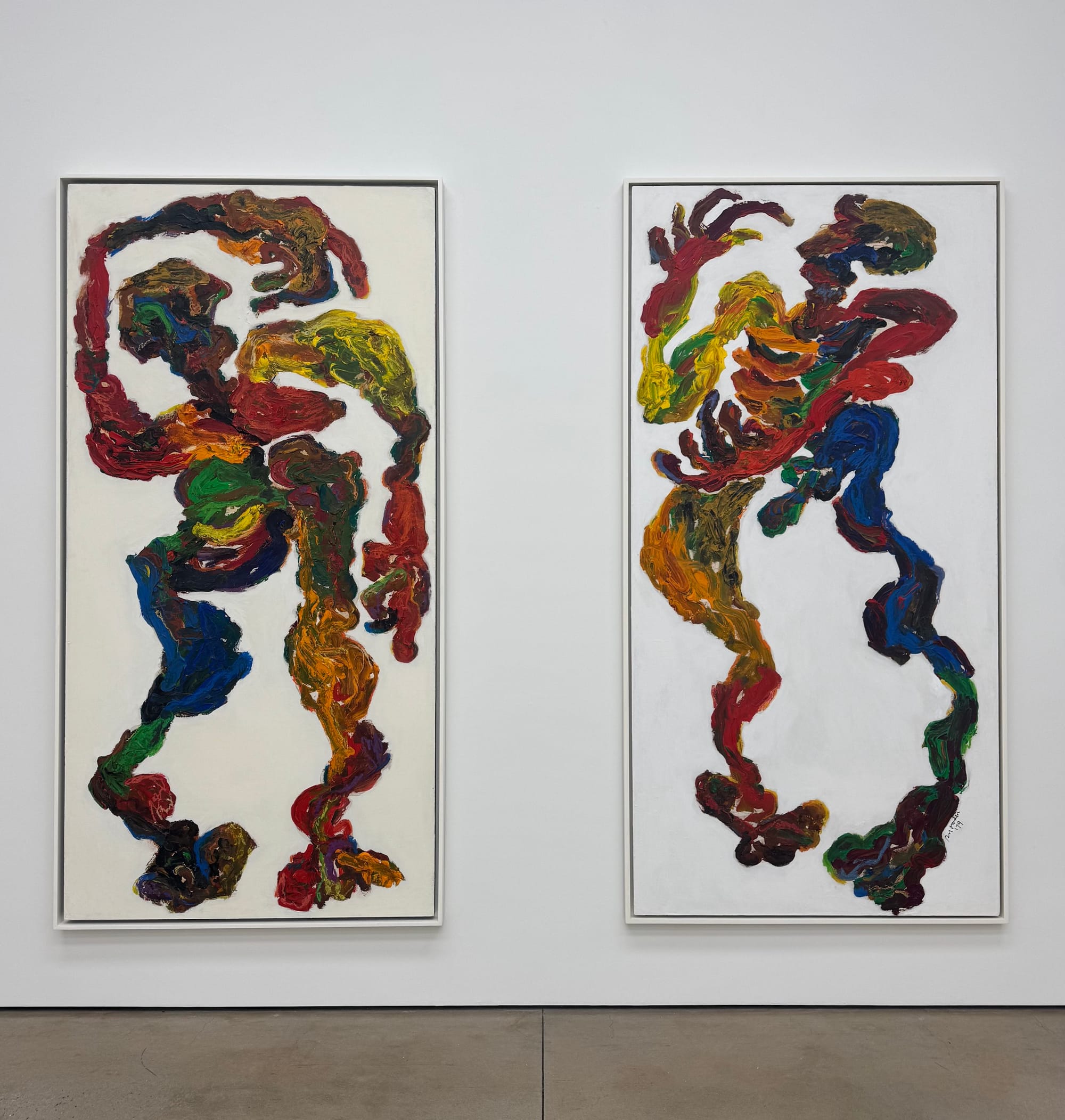 Sylvia Snowden, “Theresa Black” (1997) (left) and “Steven Thornhill” (1979) (right), both acrylic and oil pastel on Masonite, in On the Verge at White Cube (photo Jasmine Weber/Hyperallergic)
