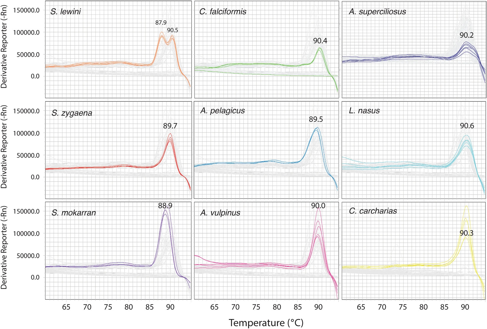 I can show you a little bit how it works. This is a paper we published in 2018. If you got a curve like this, it meant the fin you were analyzing was from one of those species. If it was a flat line, that meant it was a nontarget species.