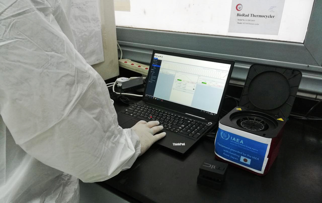 The machine for processing DNA, right, being used in COVID-19 diagnostics. Image by IAEA Imagebank via Flickr (CC BY 2.0).