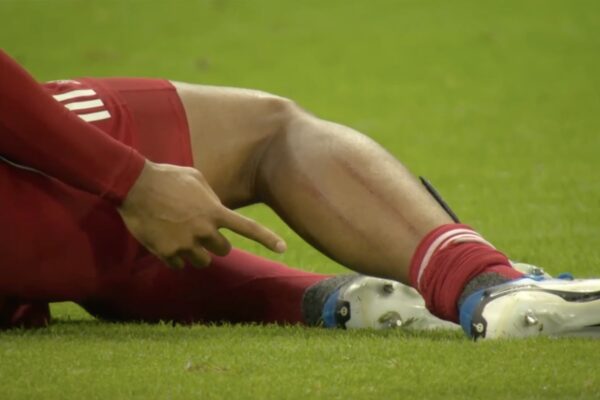 The challenge, which missed the ball entirely, saw Gordon collide with Van Dijk’s lower leg, leaving stud marks down his calf and risking serious damage to his ankle.